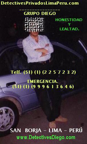 Descripción: Detectives Privados Peruanos (GRUPO DIEGO) Reunimos Pruebas, Detectamos Irregularidades. Experiencia profesional desde 1979. Investigaciones Privadas toda índole, c/unidades móviles, equipos